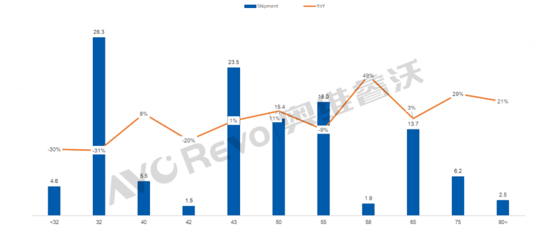 主流尺寸32/55寸大幅下降,50/75/80+寸大幅增长,大尺寸化加速