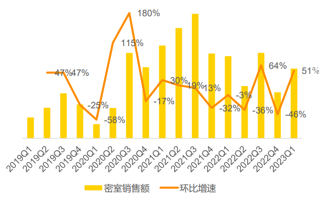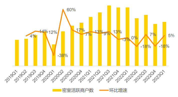 美团平台数据显示,美团平台上密室活跃商户数(每年至少有一次交易的商户)自2022年Q1环比增速由正转负,在2022年呈下跌趋势,自2023年Q1密室行业开始恢复,活跃商家数恢复趋势明显(见图4)。