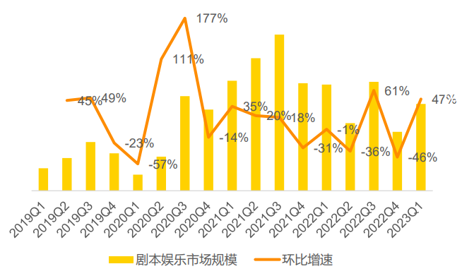 疫情前三年,重参与、强互动的各种沉浸式线下娱乐场所虽受到较大冲击,但仍保持较强的消费韧性,随着经营情况的好转逐步恢复。在2020-2021两年期间,美团平台数据显示线下娱乐消费总额总量上仍然保持惯性增长。直到2022年,才出现明显的下降。美团平台数据显示,2023年一季度,剧本娱乐市场规模环比增长47%(见图1),表现出强劲韧性与活力,全国线下剧本娱乐消费出现明显回升,这说明线下剧本娱乐消费已经成为一种具有旺盛生命力的娱乐业态。