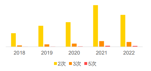 密室消费粘性高、消费频次高。密室消费具有粘性高、消费频次高的特征,用户一旦喜欢上密室,就会持续体验新项目,刷新密室主题。美团平台数据显示,从2018年到2021年,年度消费2单、3单、5单以上用户的数量呈上升趋势(见图9)。