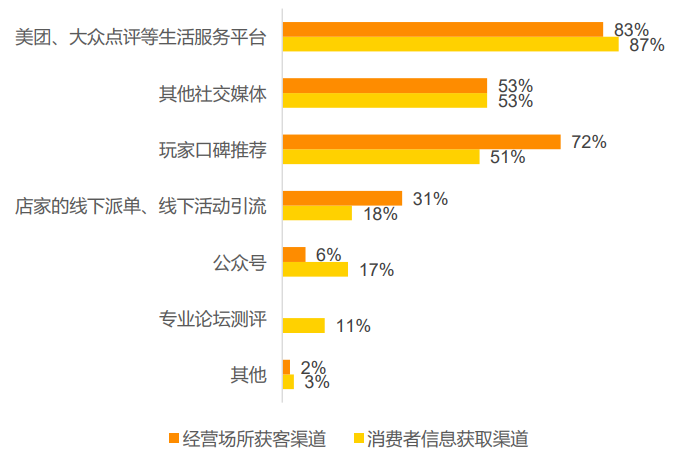 从消费者端来看,87%的消费者平时通过美团和大众点评等生活服务平台了解信息(见图2)。消费者大多首选美团、大众点评等生活服务平台完成预定,接着消费者大多会通过其他社交平台对剧本娱乐信息进行分享、讨论。从商家端来看,83%的商户认为美团、大众点评等生活服务电子商务平台是最主要的引流获客来源。为了更好联通起商户与消费者、消费者与消费者之间的信息,2021年中期,美团、大众点评与商家密切合作,分别新增密室逃脱和剧本杀类目,并且不断完善主题场次预定、在线预约、拼团、主题获奖标签、品牌展示窗口等功能内容。以上一系列改进,明显促进了经营场所获客能力和经营转化能力的提升,并大幅提升了消费者体验,美团和大众点评加快密室行业供给侧线上整合,正在成为密室行业的流量核心入口。