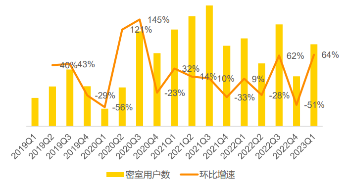 密室活跃用户数量逐年增加。美团平台数据显示,密室活跃用户(每年至少有一次交易的用户)数量逐年增加,即使在疫情严重的2020-2021两年期间,密室活跃用户也保持较高速度增加,但这一趋势在2021年Q4开始转变,在2022年密室用户数降幅较大,但在2023年Q1逐渐恢复(见图7)。