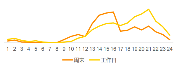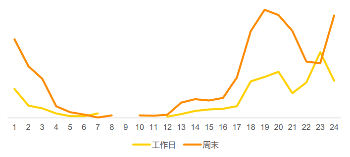 剧本杀订单高峰时期持续时间较长,夜间消费特征明显。美团研究院分别随机抽取2020年9月某工作日、2022年9月某个周末不同时间段的美团平台剧本杀订单数据,发现无论是工作日还是周末,剧本杀订单量从17时开始骤升,从凌晨2点开始回落(见图14)。在工作日,剧本杀订单量高峰在19-20点和23点,在周末,剧本杀订单量高峰在18-20时和24时-凌晨1点。剧本杀订单高峰时间持续时间较长与其娱乐时常较长有关。同时剧本娱乐已经逐渐成为年轻消费者夜间消费的选择之一。