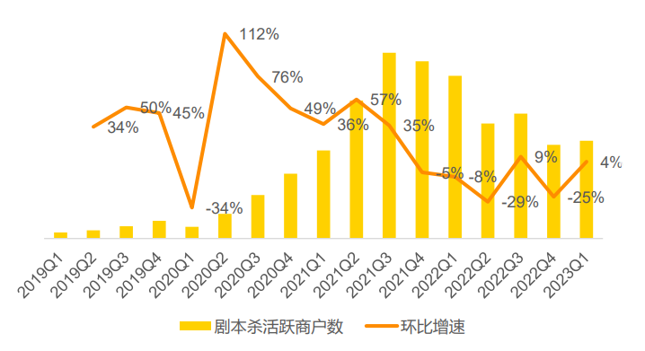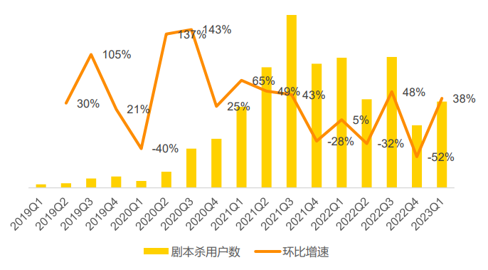 美团平台数据显示,剧本杀2020年的活跃用户(每年至少有一次交易的用户)数量为124万,2021年的活跃用户数量为517万,2022年的活跃用户数为434万,在疫情严重的2020-2022两年期间剧本杀活跃用户先升后降,2023年Q1恢复明显(见图13)。