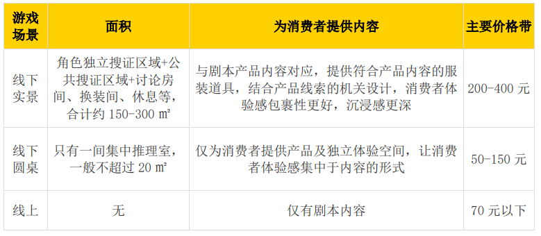 沉浸式程度的不同导致剧本杀价格带和服务内容的差异。数据显示,中国消费者对于不同形式的剧本杀价格接受度有所区别,整体来说,网民对于剧本杀的价格接受度由高到低排列的顺序是线下实景>线下圆桌>线上。线下实景的剧本杀大部分都会带有换装、闯关等环节,布景设置较为复杂,因此消费者价格接受度更高;线下圆桌的成本主要是剧本和场地,消费者的体验主要集中在剧本本身,因此价格接受度与实景相比略低。整体来看,约97%的剧本杀平均客单价低于200元(见表1)。