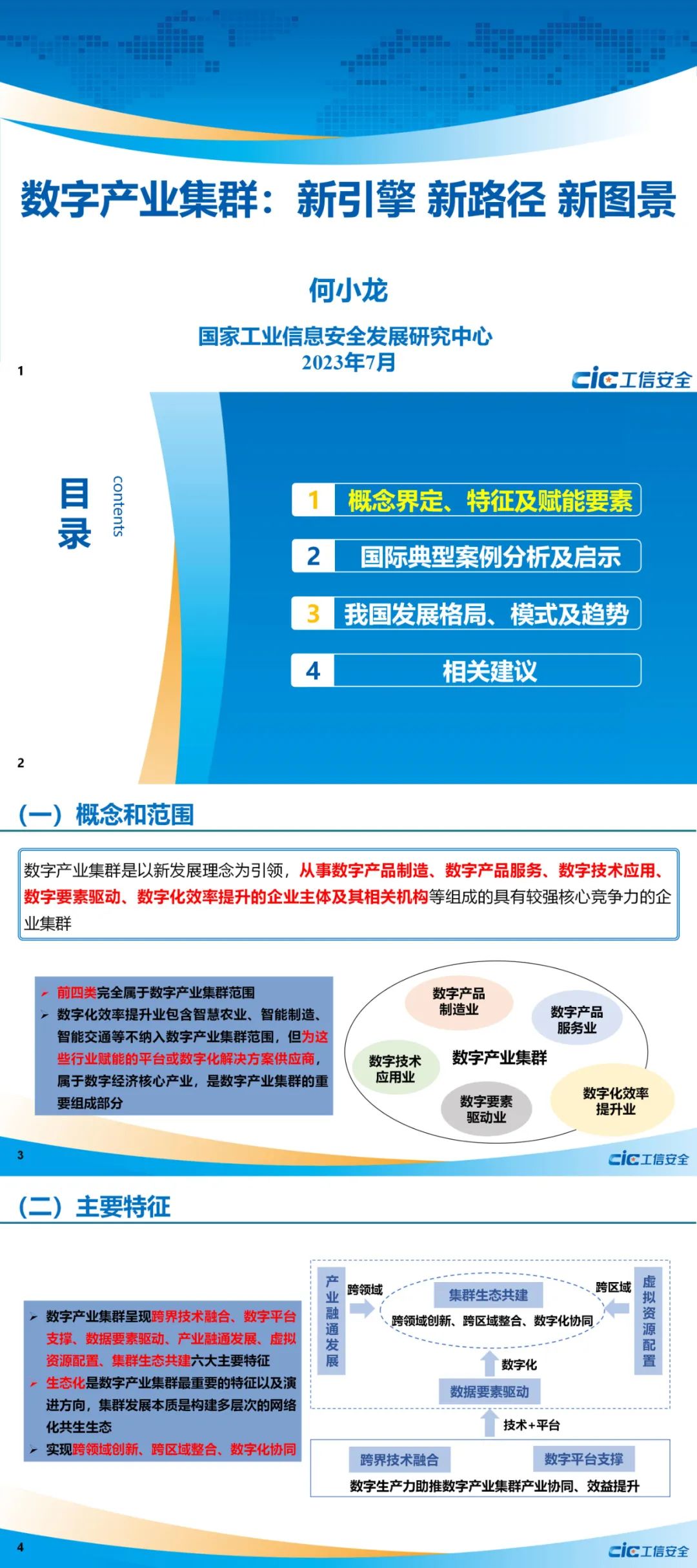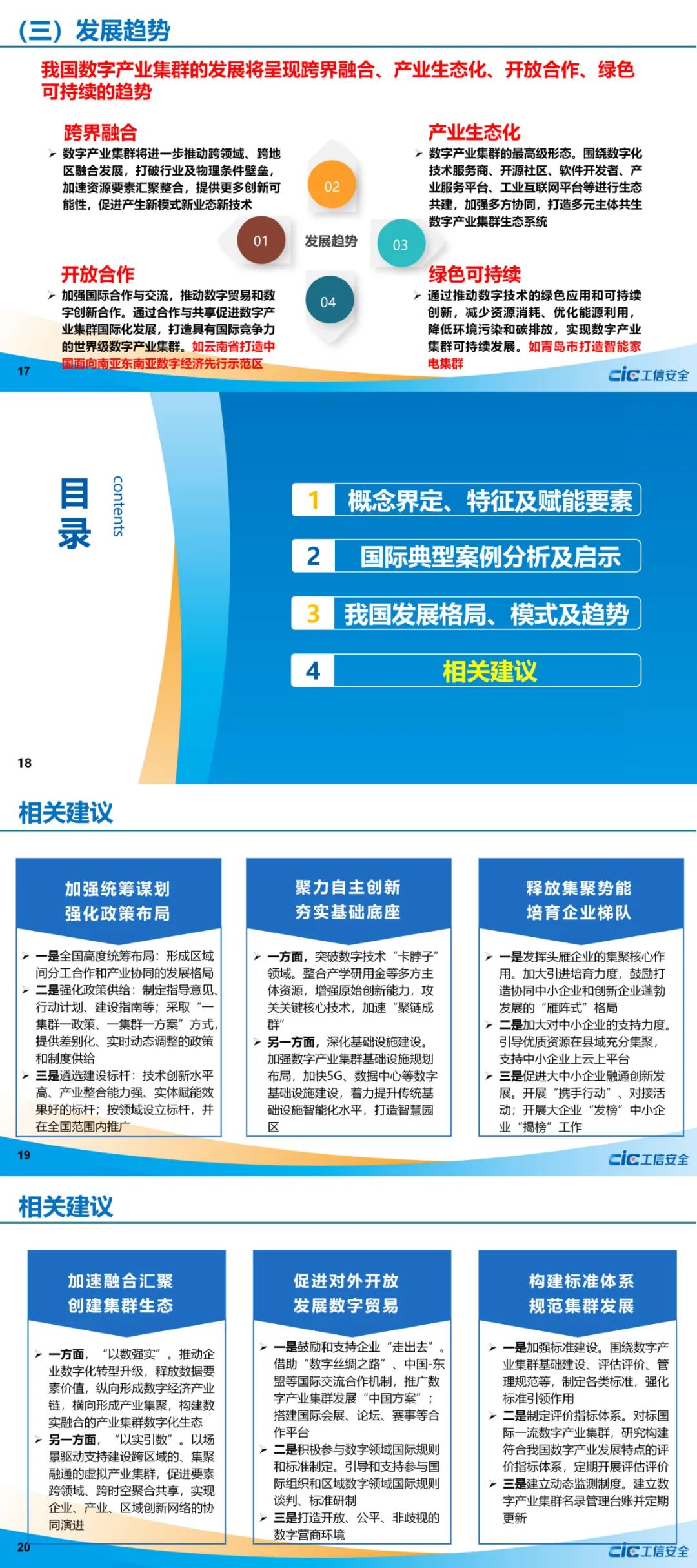 最后,《研究报告》提出加强统筹谋划、强化政策布局,聚力自主创新、夯实基础底座,释放集聚势能、培育企业梯队,加速融合汇聚、创建集群生态,促进对外开放、发展数字贸易,构建标准体系、规范集群发展等措施,分阶段分领域打造具有国际竞争力的数字产业集群。