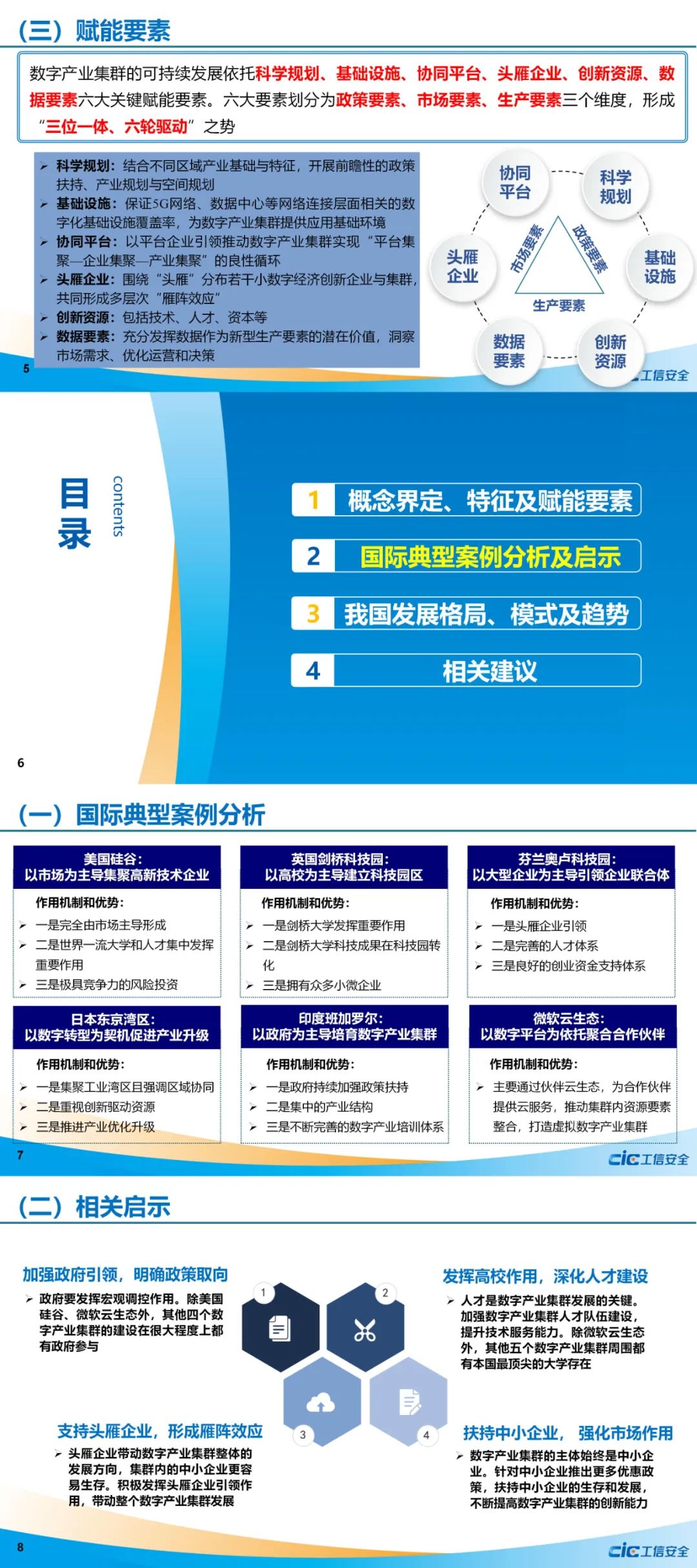 通过对美国硅谷、英国剑桥科技园、芬兰奥卢科技园、日本东京湾区、印度班加罗尔、微软云生态六类国际数字产业集群的研究分析,总结得出四大启示:一是加强政府引领,明确政策取向;二是发挥高校作用,深化人才建设;三是支持头雁企业,形成雁阵效应;四是扶持中小企业,强化市场作用。