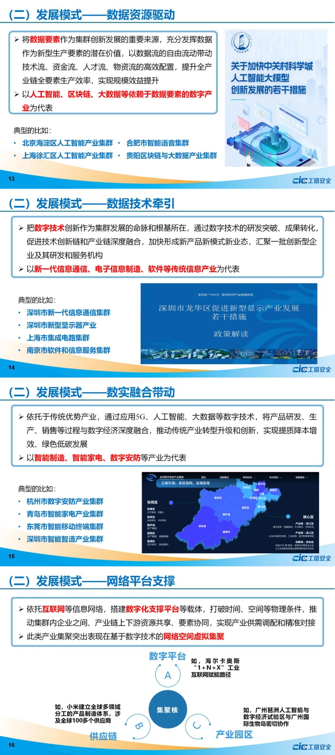 根据依托的资源禀赋不同,当前我国数字产业集群可划分为数据资源驱动、数字技术牵引、数实融合带动、网络平台支撑四种发展模式。数据资源驱动模式将数据要素作为集群创新发展的重要来源,充分发挥数据作为新型生产要素的潜在价值,以数据流的自由流动带动技术流、资金流、人才流、物资流的高效配置,提升全产业链全要素生产效率,实现规模效益提升,以人工智能、区块链、大数据等依赖于数据要素的数字产业为代表。数字技术牵引模式把数字技术创新作为集群发展的命脉和根基所在,通过数字技术的研发突破、成果转化,促进技术创新链和产业链深度融合,加快形成新产品新模式新业态,汇聚一批创新型企业及其研发和服务机构,以新一代信息通信、电子信息制造、软件等传统信息产业为代表。数实融合带动模式依托传统优势产业,通过应用5G、人工智能、大数据等数字技术,将产品研发、生产、销售等过程与数字经济深度融合,推动传统产业转型升级和创新,实现提质降本增效、绿色低碳发展,以智能制造、智能家电、数字安防等产业为代表。网络平台支撑模式依托互联网等信息网络,搭建数字化支撑平台等载体,打破时间、空间等物理条件,推动集群内企业之间、产业链上下游资源共享、要素协同,实现产业供需调配和精准对接。此类产业集聚突出表现在基于数字技术的网络空间虚拟集聚。未来,我国数字产业集群的发展将呈现跨界融合、产业生态化、开放合作、绿色可持续的趋势。