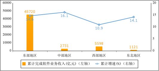 东部地区软件业收入加快增长,中部地区增势突出。上半年,东部地区完成软件业务收入 45720 亿元,同比增长 14.6%,增速较 1-5 月份提高 1.1 个百分点;中部地区完成软件业务收入 2732 亿元,同比增长 16.1%,增速较 1-5 月份提高 0.5 个百分点;西部地区完成软件业务收入 5598 亿元,同比增长 10.9%,增速较 1-5 月份提高 0.2 个百分点;东北地区完成软件业务收入 1121 亿元,同比增长 14.1%,增速较 1-5 月份提高 0.3 个百分点。四个地区软件业务收入在全国总收入中的占比分别为 82.9%、5%、10.1% 和 2%。
