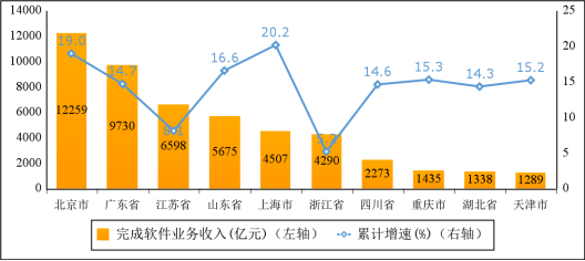 主要软件大省收入占比小幅提升。上半年,软件业务收入居前 5 名的省份中, 北京市,广东省,江苏省,山东省,上海市软件收入分别为 12259 亿元、9730 亿元、6598 亿元、5675 亿元和 4507 亿元,分别增长 19%、14.7%、8.1%、16.6% 和 20.2%,五省 (市) 合计软件业务收入 38769 亿元,占全国比重为 70.3%,占比较去年同期提升 0.9 个百分点。
