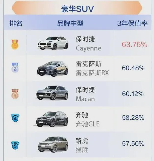 豪华车阵营中,保时捷卡宴为“保值王者”,3年保值率为63.76%,符合其豪华车身位;其次为雷克萨斯RX、保时捷Macan、奔驰GLE、路虎揽胜等车型,保值率普遍在60%上下。