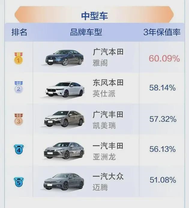 中型车因为价格更高,其保值率也相对更高一些,排名第一的仍为本田,广汽本田雅阁的3年保值率为60.09%;本田英仕派、丰田凯美瑞则紧随其后。