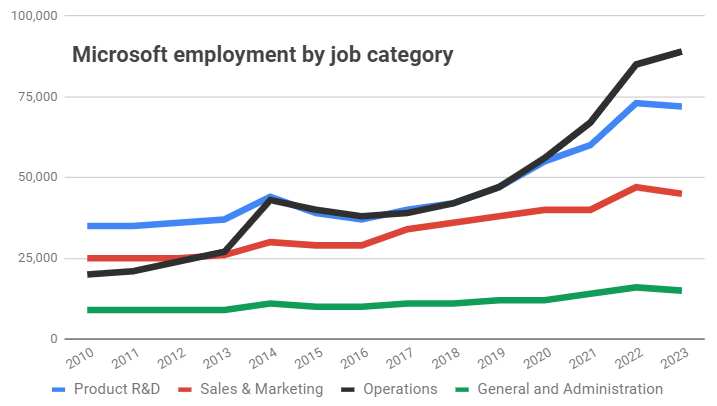 另一方面,运营岗位的员工增加了 4000 人(近 5%),达到 89000 人。自 2020 年以来,这使得运营职位成为公司内最大的就业类别。
