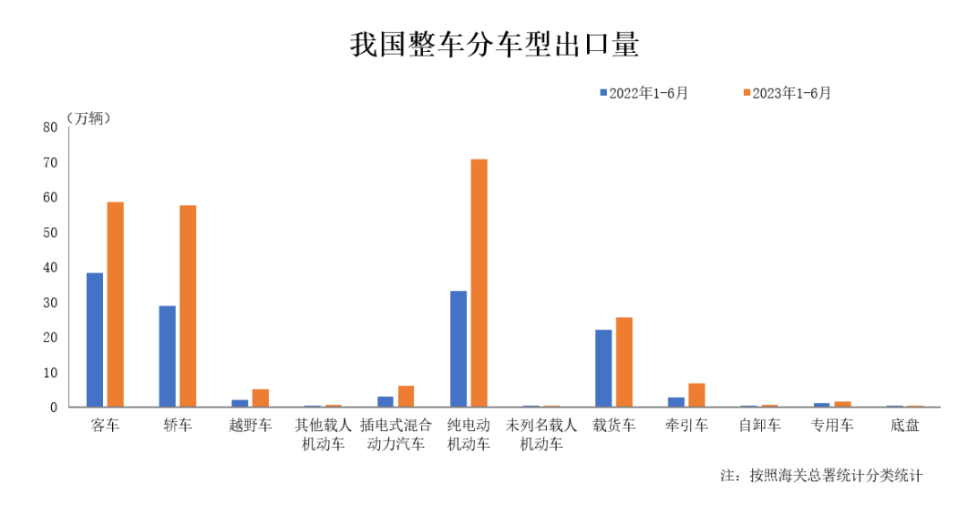 2023年上半年,在我国汽车主要出口车型中,与上年同期相比,纯电动机动车、客车、轿车和载货车四大类主要出口量保持不同程度增长,其中纯电动机动车增速更为显著。