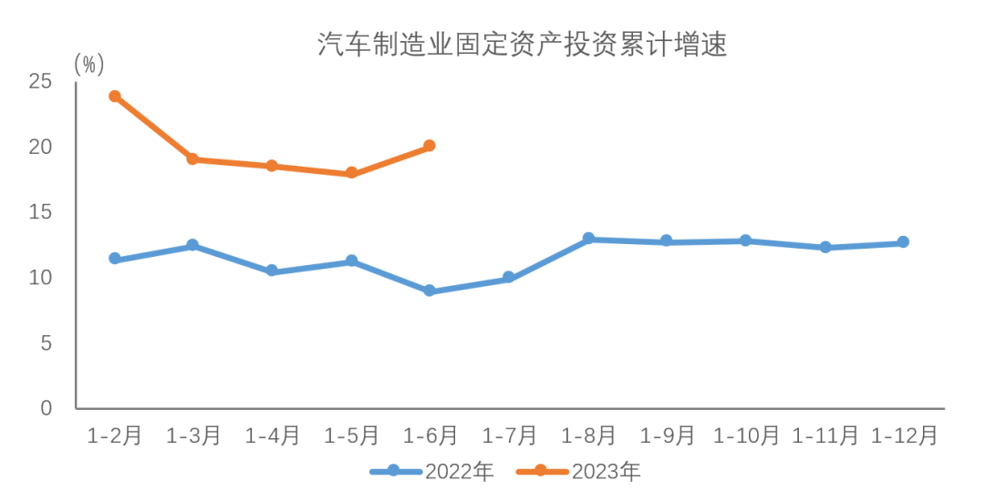 中国汽车工业协会:2023年上半年汽车制造业固定资产投资保持较快增长 据中国汽车工业协会整理的国家统计局数据显示,2023年上半年,汽车制造业固定资产投资保持较快增长。 2023年上半年,汽车制造业固定资产投资同比增长20.0%,高于全国固定资产投资16.2个百分点。 来源:中汽协会行业信息部 更多阅读:中国汽车工业协会:2022年1-11月汽车制造业利润同比小幅增长中国汽车工业协会:2023年1-7月汽车制造业利润同比微增中国汽车工业协会:2022年汽车制造业利润略有增长中国汽车工业协会:2020年汽车制造业固定资产投资同比下降12.4%中国汽车工业协会:2022年6月汽车制造业工业增加值同比呈明显增长中国汽车工业协会:2022年1-5月汽车制造业实现利润同比降幅比上月略有扩大中国汽车工业协会:2022年1-8月汽车制造业固定资产投资稳中有升中国汽车工业协会:2022年1-4月汽车制造业固定资产投资同比增速略有减缓中国汽车工业协会:2021年1-2月汽车制造业固定资产投资同比结束下降中国汽车工业协会:2023年1-5月汽车制造业利润较快增长中国汽车工业协会:2022年汽车制造业固定资产投资保持快速增长中国汽车工业协会:2023年1-5月汽车制造业营业收入同比保持较快增长中国汽车工业协会:2023年1-5月汽车制造业营业收入同比保持较快增长中国汽车工业协会:2023年一季度汽车制造业固定资产投资保持增长中国汽车工业协会:2023年1-5月汽车制造业固定资产投资保持较快增长