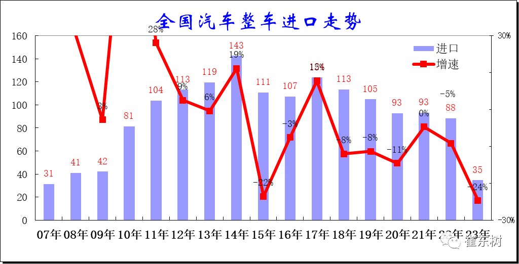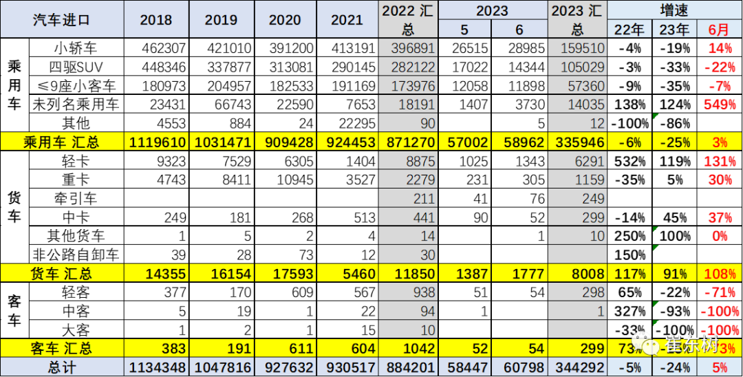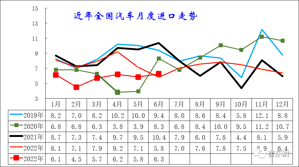 在2013-2015年世界经济低迷情况下的剧烈下滑后,2016-2017年进口增速稍有企稳改善,2018年-2020年以来持续下滑,2021年稍有企稳。2022年的进口车回升态势被疫情影响。