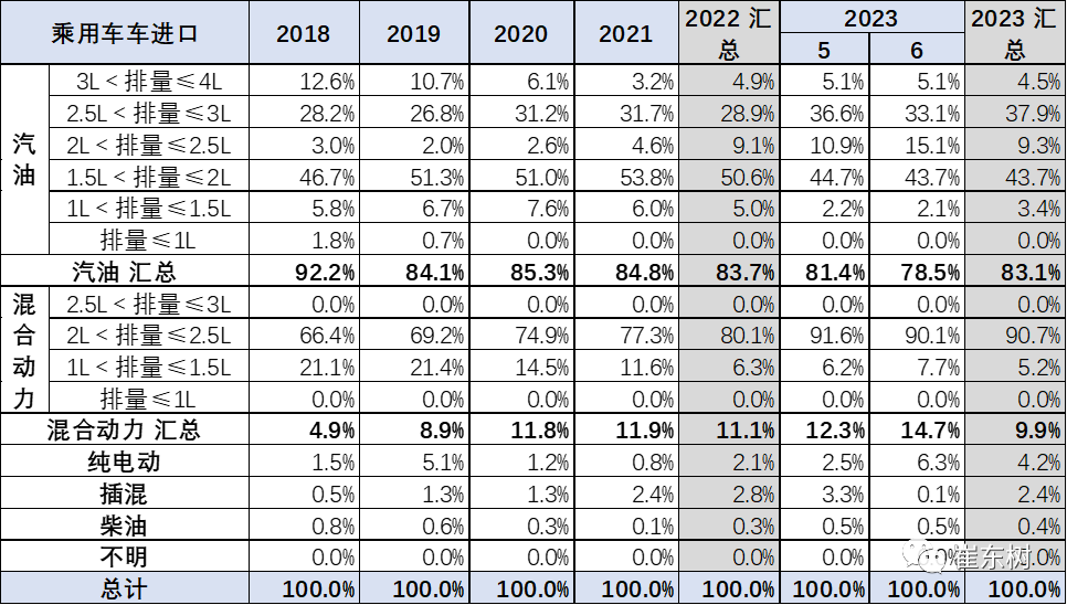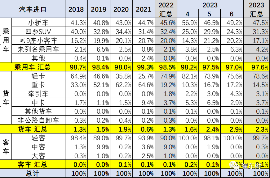 卡车中柴油车占比下降,而汽油货车的占比大幅提升。2023年1-6月的高端汽油皮卡进口表现改善。
