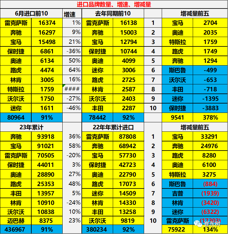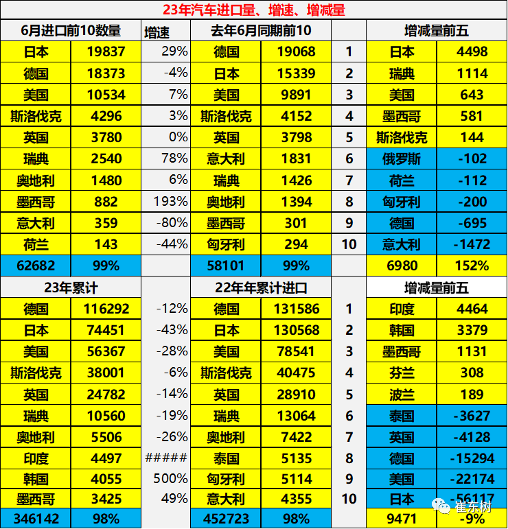 2023年进口车表现相对优秀的是印度、韩国、墨西哥等主力国家,而6月瑞典等进口车增量很好。但6月日本的进口同比回升,德国与美国的进口车偏弱,而部分欧洲进口车同比表现分化。