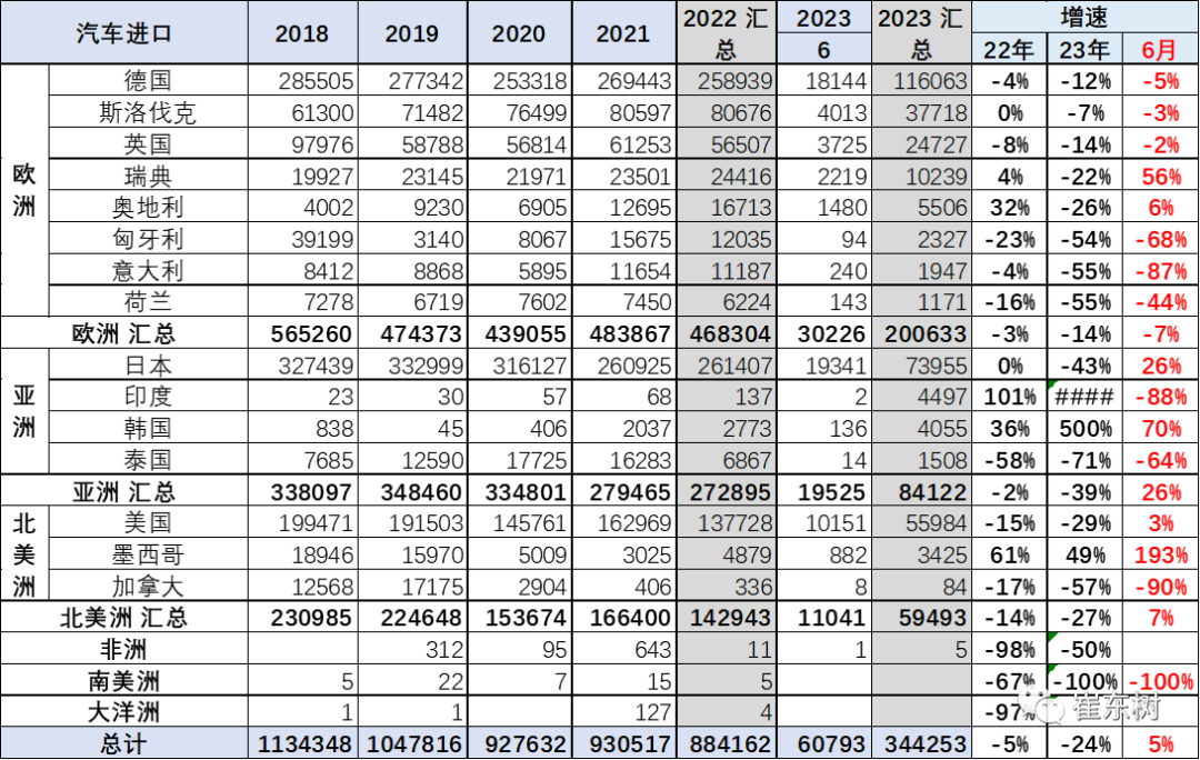 2023年日本进口车暴跌态势明显,1-6月日本进口下降43%。而美国等进口车下降29%。欧洲进口下降14%。