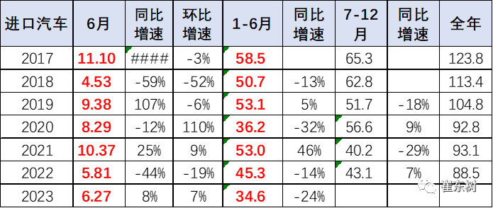 2023年进口规模锐减,1-6月进口仅有35万台,同比下降24%,目前的月度进口量维持在月均6万台左右水平。