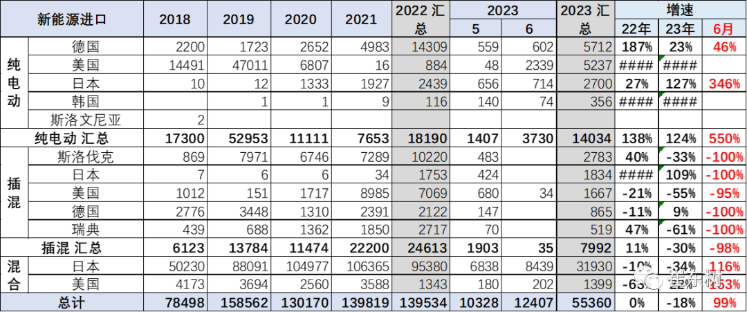 2023年1-6月的纯电动回暖增长体现海外新能源转型趋势。插混进口表现偏弱。