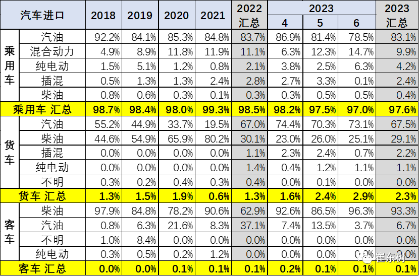 由于乘用车为主的进口结构,近几年乘用车中的柴油车占比持续下行。随着皮卡的进口加大,货车中的柴油车的比例下降较大。