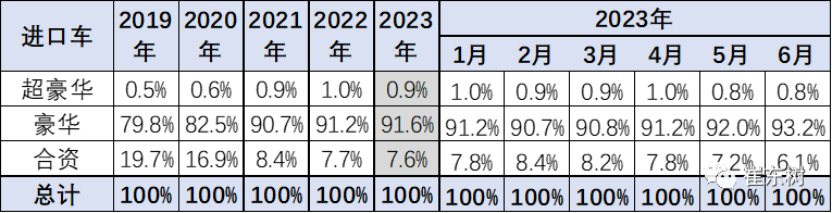 目前进口车增长主要靠豪华车的增长,豪华车占比已经从2019年的78%上升到2023年的91.6%。超豪华车的进口占比保持稳定,体现超高端消费群体的购买力实际上是上升的。
