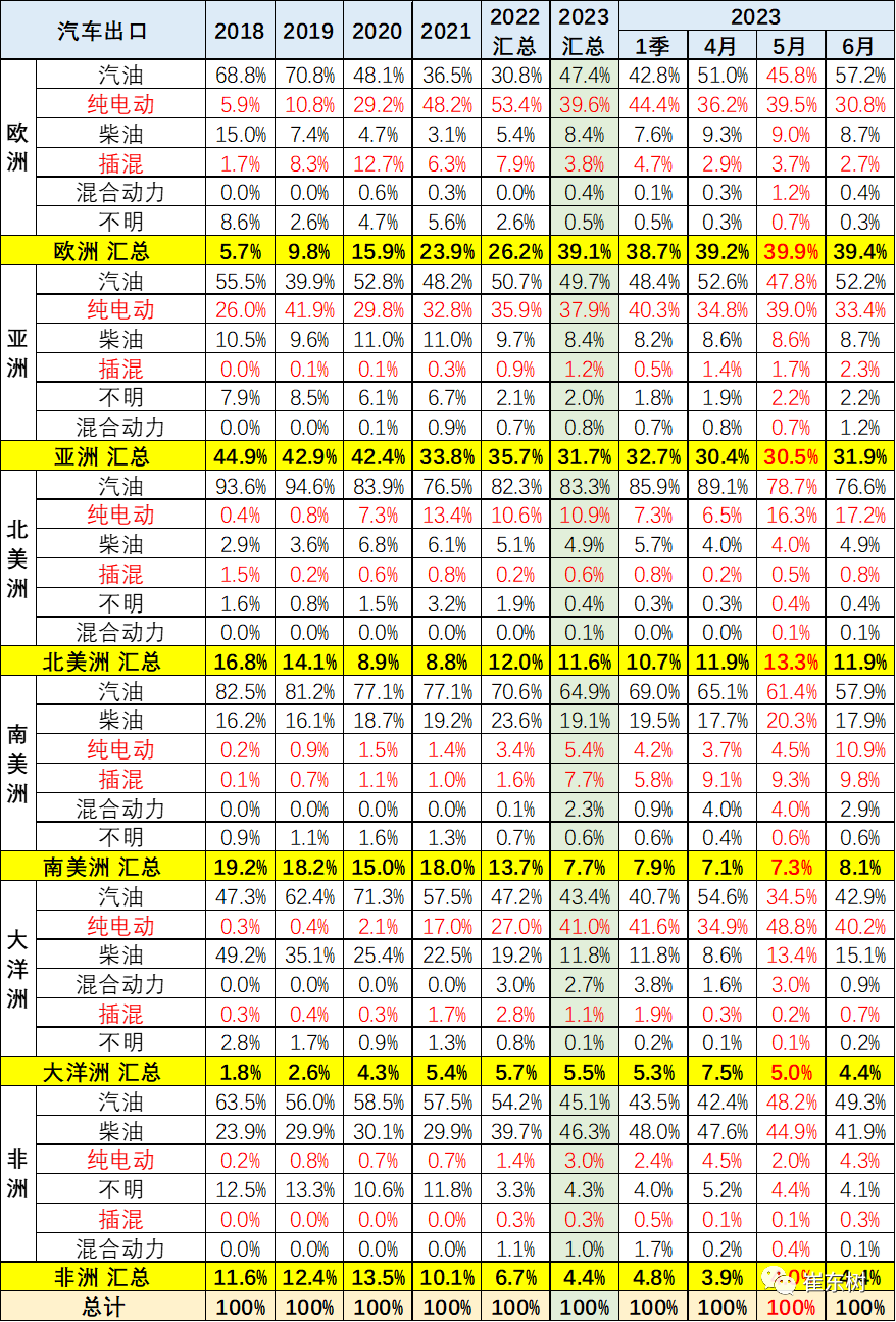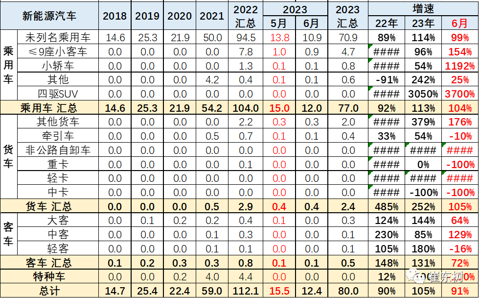 2021-2022年初,随着汽车独资企业的出口,中国汽车出口欧洲发达国家市场取得巨大突破。新能源车是中国汽车出口的核心增长点,改变了依赖亚洲和非洲等部分穷国和不规范国家的汽车出口被动局面。2020年新能源车出口22.4万,表现好;2021年新能源车出口59万台,继续持续走强;2022年累计出口新能源车112万台;2023年1-6月出口新能源车80万台,同比增长105%;其中2023年新能源乘用车出口77万台,同比增长113%,占比新能源汽车出口96%。