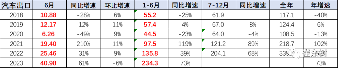 2023年6月中国汽车出口达到41万台,6月出口继续保持历史高位的走势.由于2022年的上海恢复带来的高基数,今年6月的出口增长超过61%,因此中国汽车出口暴增的局面已经持续出现。