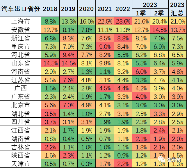 上海对中国出口的重要意义极其明显,2021年上海占中国出口的23%的比例;2022年上海占中国出口24%的比例;2023年1-6月上海占中国出口21%。这里主要是由于上海本地的企业相对比较优秀,尤其是上汽乘用车和特斯拉两家企业,出口量都相对较强,所以形成较大的增长表现,但上汽通用出口表现平稳。