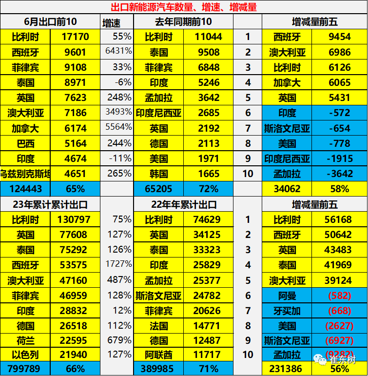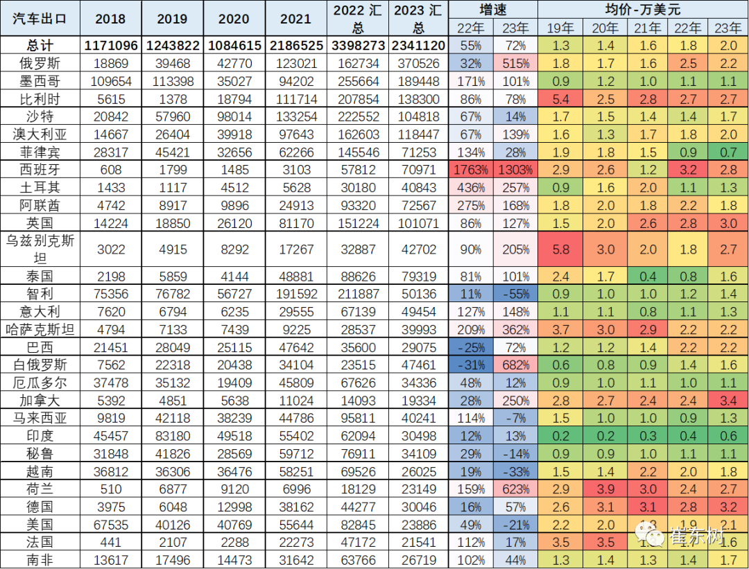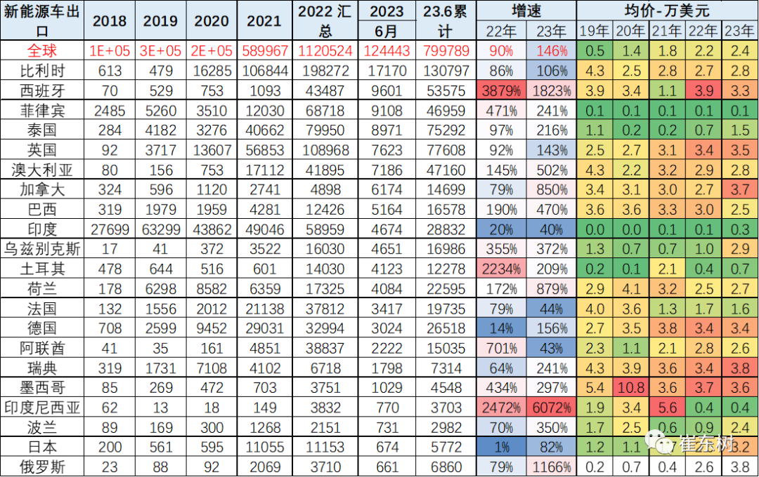 2023年1-6月中国新能源乘用车出口80万台,达到146%的强势增长,全年对欧洲国家的新能源车出口表现很强。对印度、孟加拉、菲律宾的出口走势分化,但均价均很低。