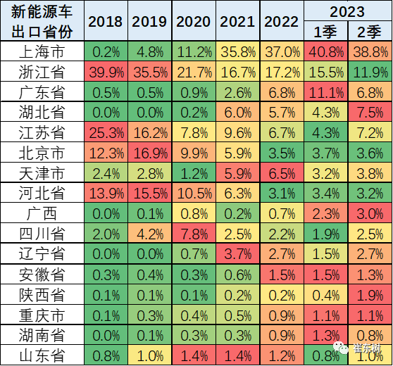 随着特斯拉进入中国,中国汽车出口格局改变。2023年新能源汽车出口比较强的地区是上海、浙江、广东、江苏、湖北等。