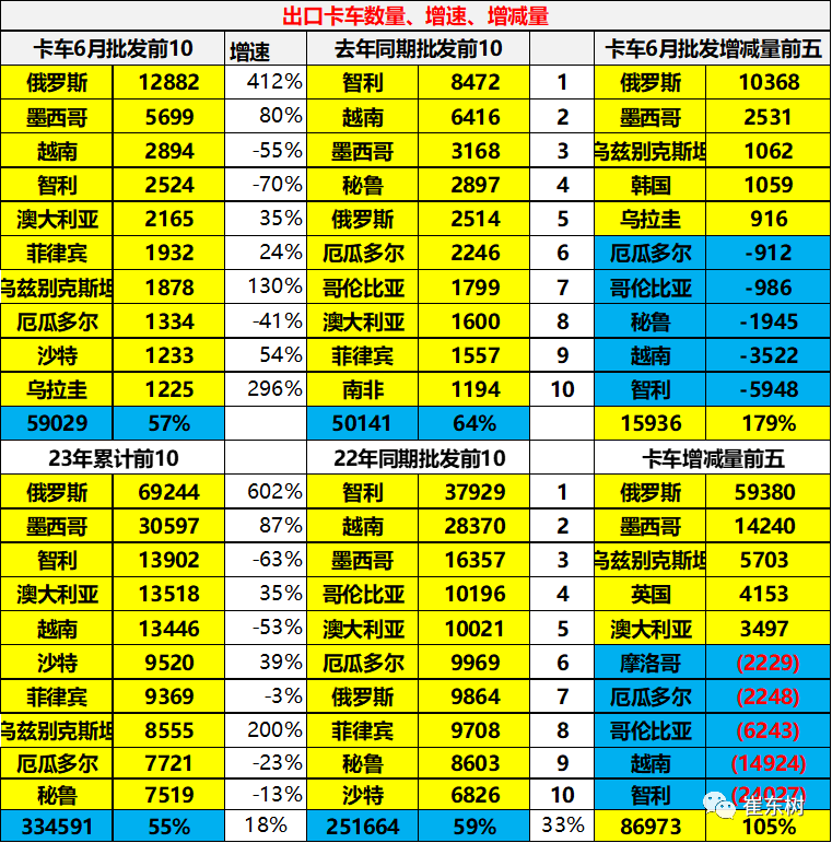 2023年1-6月的俄罗斯、墨西哥的卡车出口较强。智利、越南的卡车出口下降。