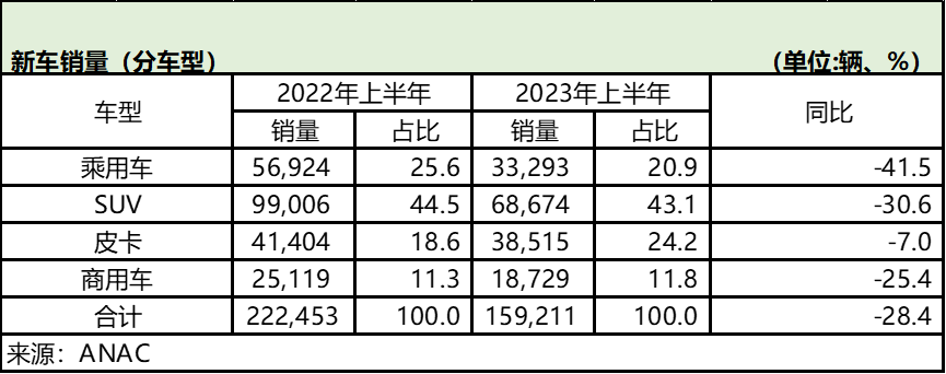 根据智利全国汽车工业协会(ANAC)的数据显示,2023 年上半年(1-6 月)新车销量(不包括公共汽车等大型车辆)同比下降 28.4%,为 159211 辆。ANAC指出,由于国内经济增速放缓带来国内需求下降,导致销量下降。