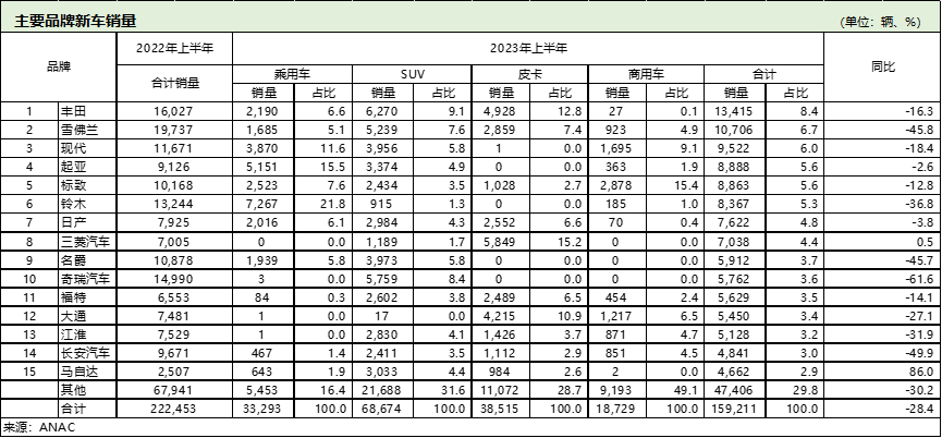 新车销量排名前5的品牌分别是丰田(份额占比:8.4%)、雪佛兰(6.7%)、现代(6.0%)、起亚(5.6%)和标致(5.6%)。从 ANAC 报告中的上半年数据可以确认,在 2014 年以来的 10 年间,丰田首次位居榜首。丰田销量增长的原因是其SUV品牌 RAIZE(2249 辆)、COROLLA CROSS(1736 辆)、RAV4(1377 辆)销量强劲,超过雪佛兰和奇瑞汽车,位居SUV榜首。另一方面,在排名前 15 的品牌中,除三菱汽车(+0.5%)和马自达(+86.0%)外,其他品牌均出现同比下滑。