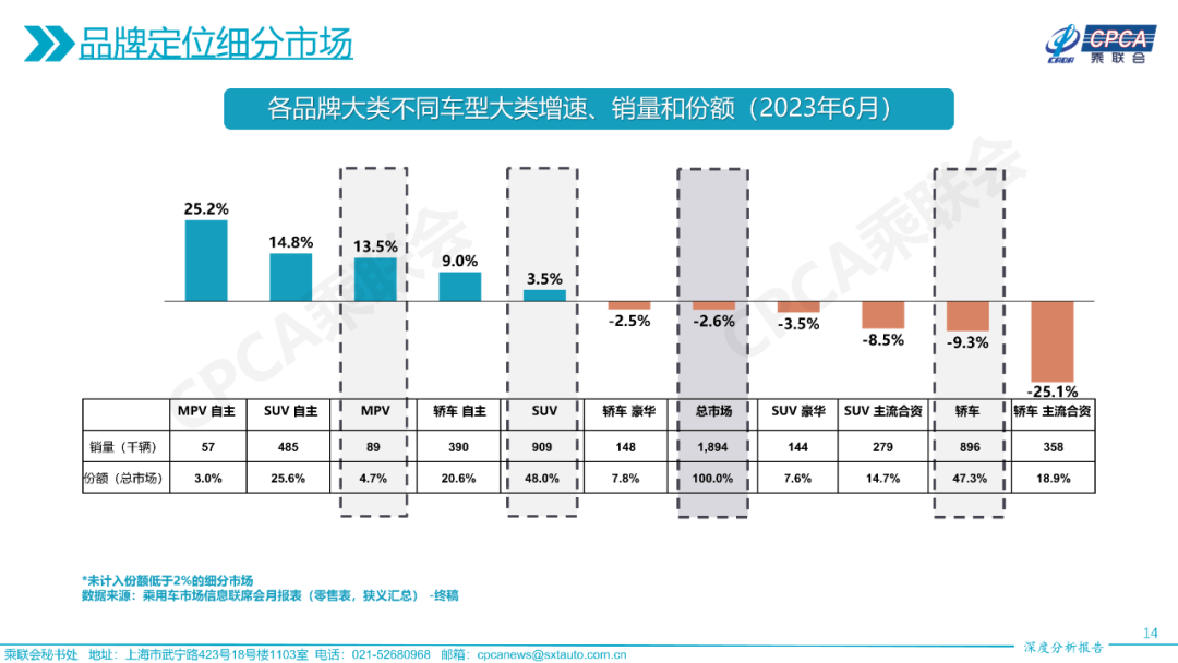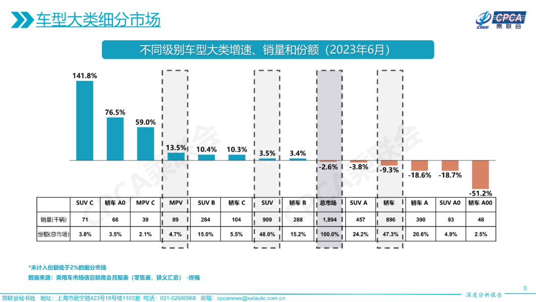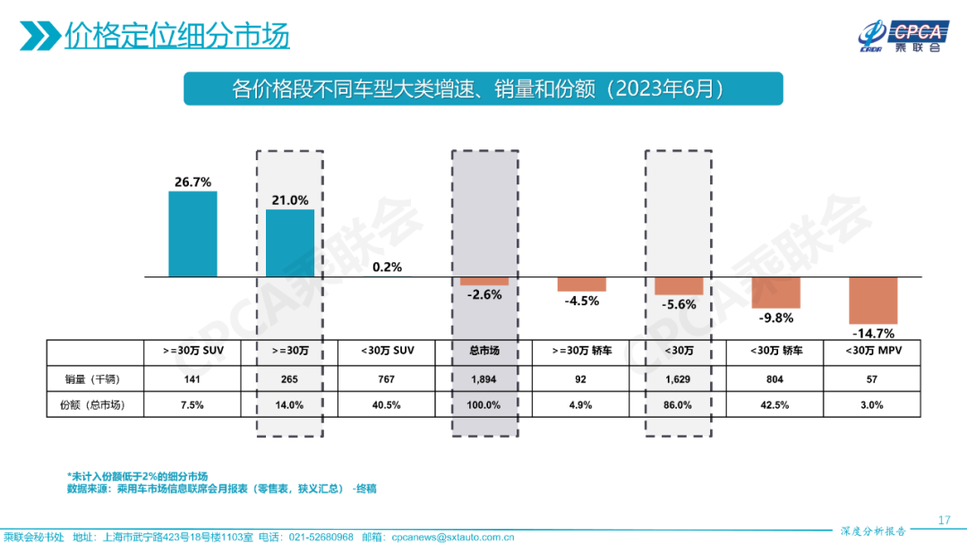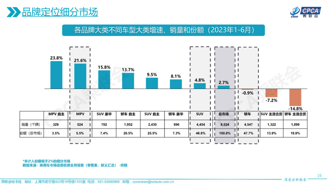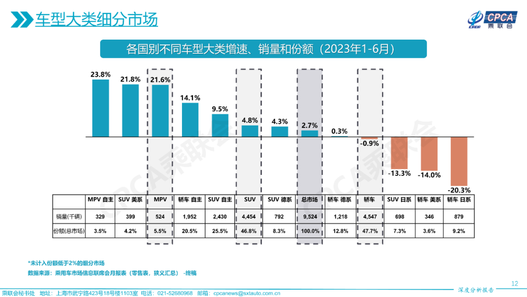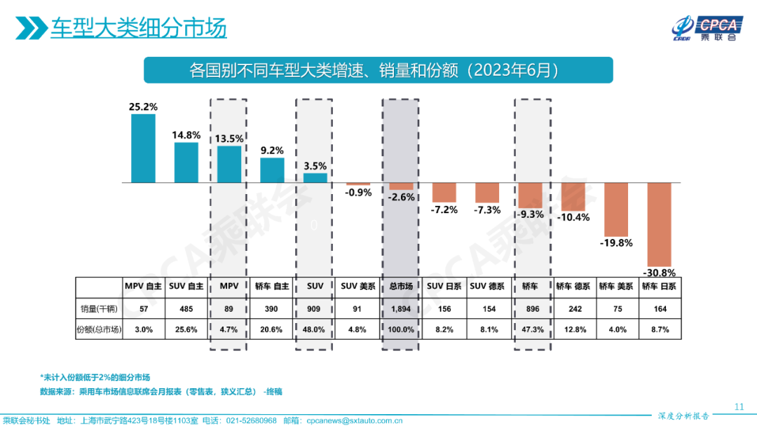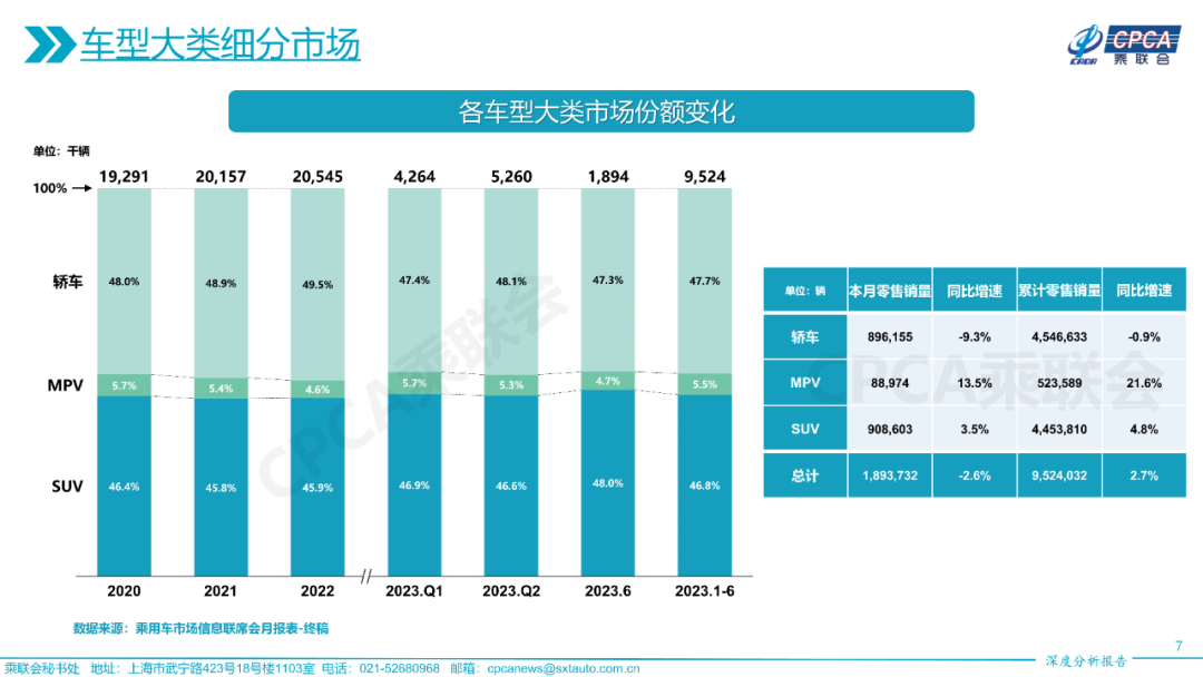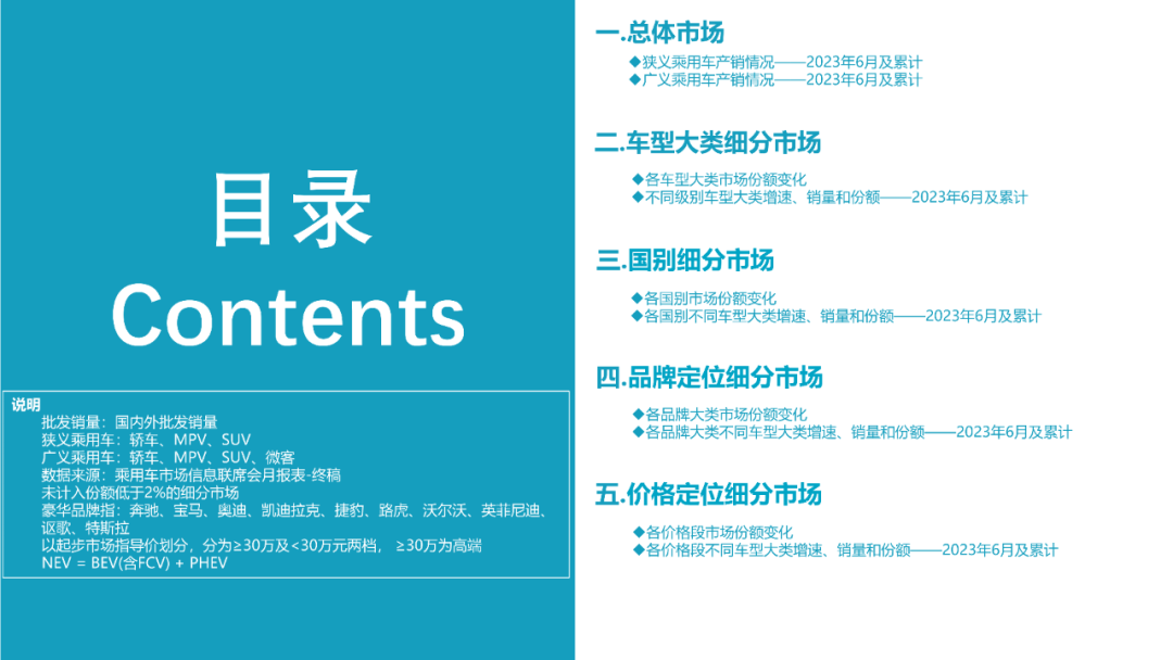乘联会:2023年6月份全国乘用车市场深度分析报告 一、总体市场 狭义乘用车产销情况——2023年6月及累计 广义乘用车产销情况——2023年6月及累计 二、车型大类细分市场 各车型大类市场份额变化 不同级别车型大类增速、销量和份额——2023年6月及累计 三、国别细分市场 各国别市场份额变化 各国别不同车型大类增速、销量和份额——2023年6月及累计 四、品牌定位细分市场 各品牌大类市场份额变化 各品牌大类下不同车型大类增速、销量和份额——2023年6月及累计 五、价格定位细分市场 各价格段市场份额变化 各价格段不同车型大类增速、销量和份额——2023年6月及累计 更多阅读:乘联会:2021年9月份全国乘用车市场深度分析报告乘联会:2023年8月份全国乘用车市场深度分析报告乘联会:2022年7月份全国乘用车市场深度分析报告中国汽车流通协会: 2020年3月份全国乘用车市场深度分析报告乘联会:2021年4月份全国乘用车市场深度分析报告中国汽车流通协会:2023年5月乘用车市场运行特征分析中国汽车流通协会:202年6月全国乘用车市场运行特征分析汽车之家研究院:中国乘用车市场2021年总结及2022年展望中国汽车流通协会:2021年1月乘用车市场运行特征分析乘联会&CAM:2021年10月乘用车市场产品竞争力指数为90.9乘联会:2025年6月乘用车零售203.2万辆,同比增长15%乘联会:预计2023年3月新能源车市场零售54.9万辆 同比增长5%乘联会:2022年4月份全国乘用车市场深度分析报告乘联会:2022年12月份全国乘用车市场深度分析报告乘联会:2022年2月份全国乘用车市场深度分析报告