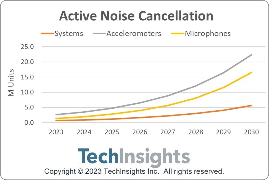 除了每个系统使用四个加速度计外,TechInsights估计,麦克风的需求将从2023年的每个系统2.1个增加到2030年的每个系统3.0个。这意味着主动降噪系统的麦克风需求将从2023年的140万增加到2030年的1650万。