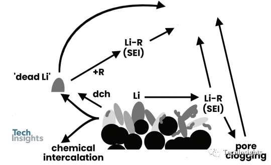 - 与电解质(R)反应生成SEI (R- li)。这可能导致孔隙堵塞,从而降低阳极动力学,从而增加锂沉积的可能性。