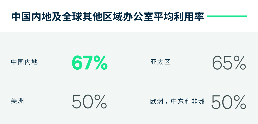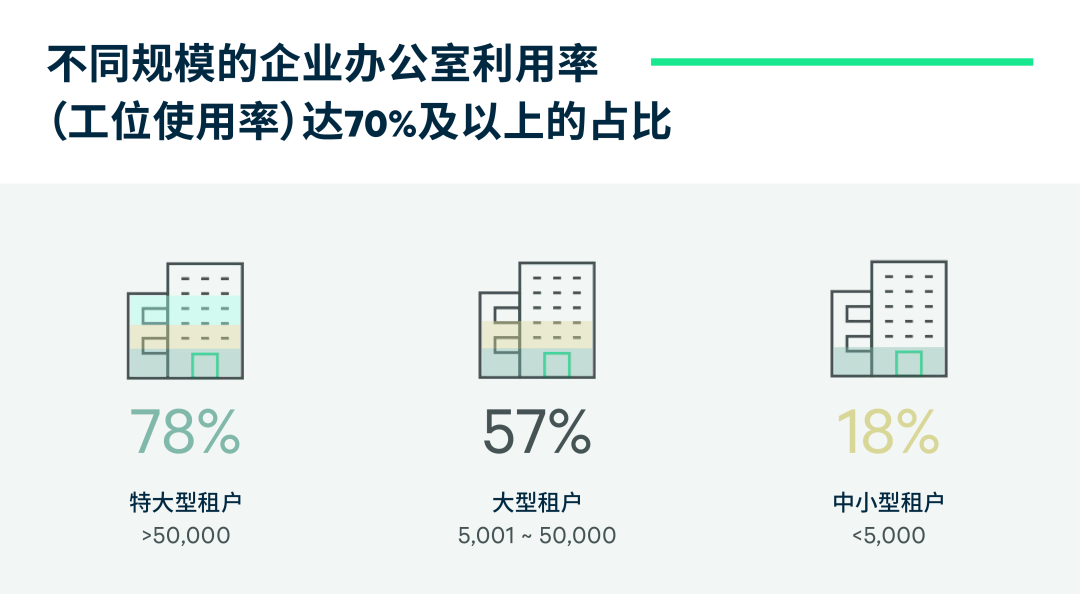 整体而言,由于国内办公习惯受居家办公影响较小,办公室平均利用率达到67%,高于全球其他区域。其中,特大型租户(全国办公面积大于50,000平方米)使用率更高,对空间灵活性和健康元素要求也更高。而中小型租户则受制于空间职能的单一性,利用率较低。