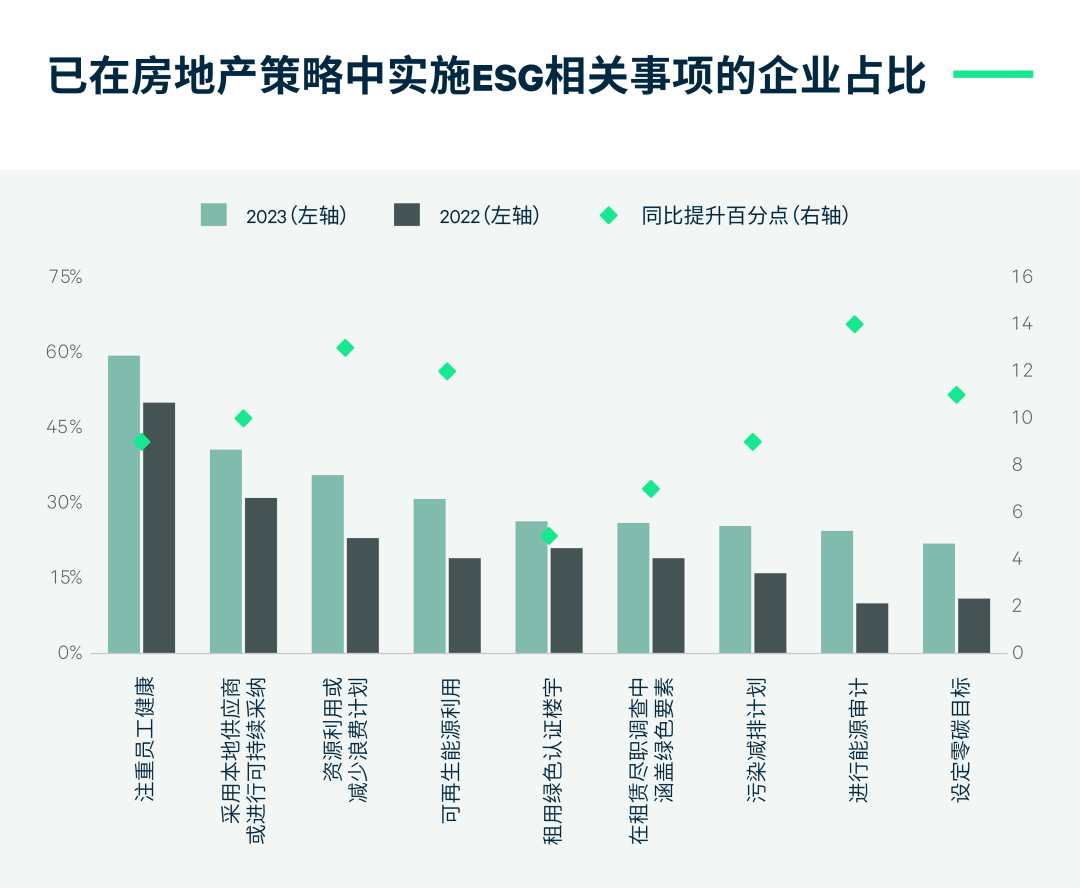 今年调查结果显示,企业在房地产规划和运营中落实ESG战略的进程全方位提速。在继续把关注员工健康作为首要ESG举措的同时,能源审计、资源循环利用和设定净零目标的实施力度大幅提升。