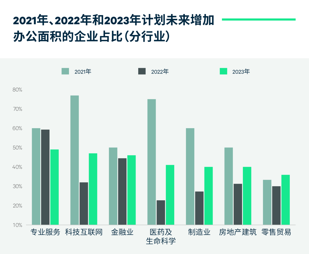 本次调查中,中资企业继续呈现更强的增长动能,52%的中资企业计划增加办公面积,同比上升10个百分点。从细分行业来看,写字楼租赁需求的三大主力引擎——金融、科技互联网和专业服务业分别占据扩张意愿榜单的前三位。制造业和医药及生命科学行业计划未来增加办公面积的企业占比也分别提升了13和18个百分点。