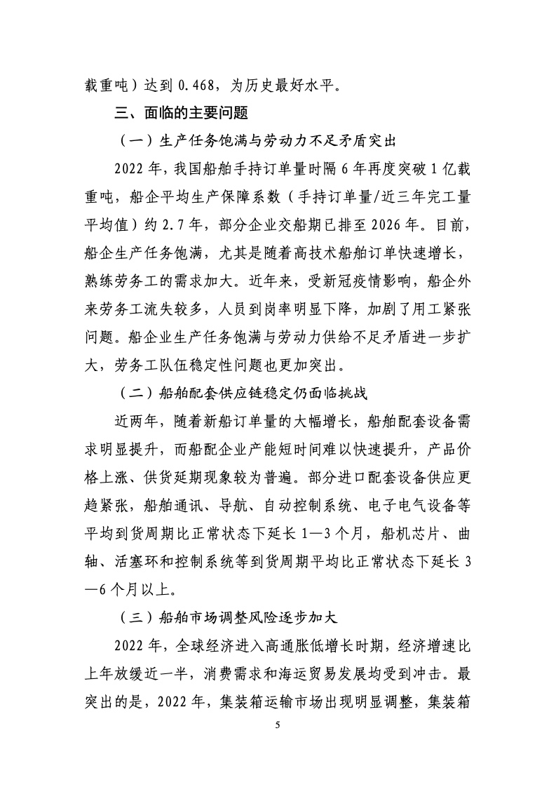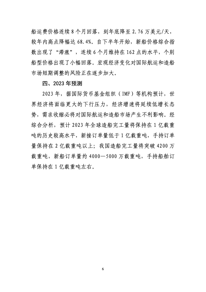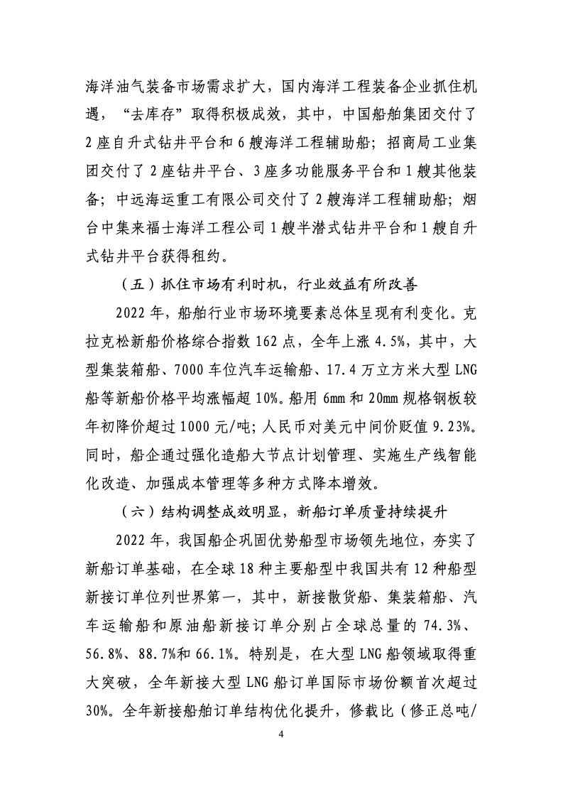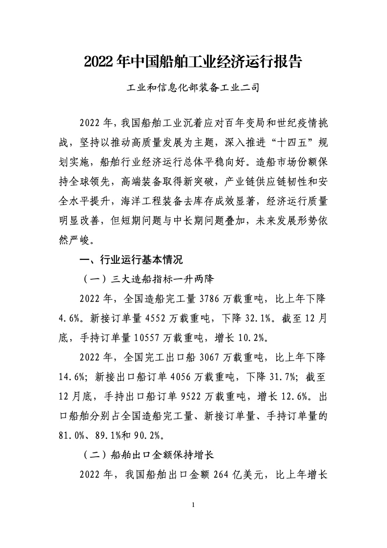 2022 年,全国造船完工量3786 万载重吨,比上年下降4.6%。新接订单量 4552 万载重吨,下降32.1%。截至12月底,手持订单量 10557 万载重吨,增长10.2%。