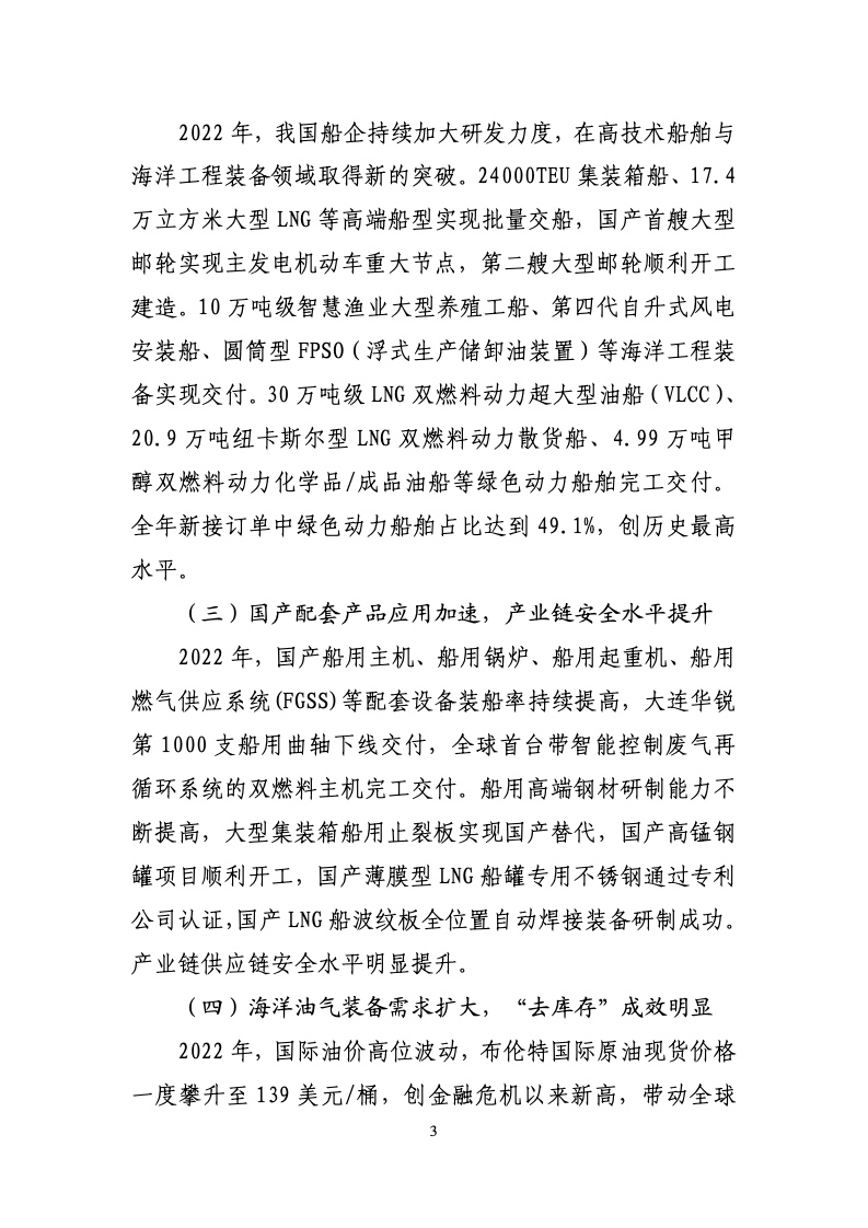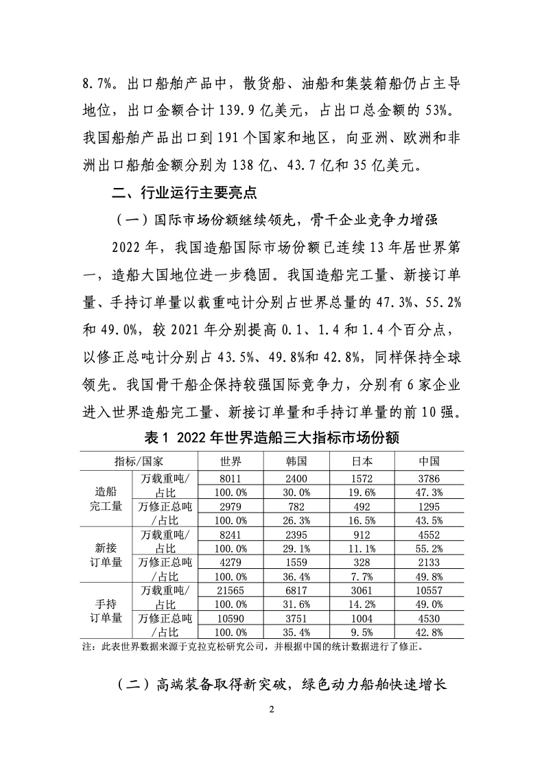 2022 年,全国完工出口船3067 万载重吨,比上年下降14.6%;新接出口船订单 4056 万载重吨,下降31.7%;截至12 月底,手持出口船订单 9522 万载重吨,增长12.6%。出口船舶分别占全国造船完工量、新接订单量、手持订单量的81.0%、89.1%和 90.2%。