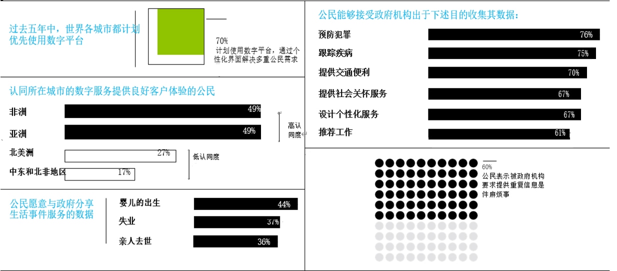 个性化服务要求政府通过数据了解公民。研究结果表明,在这方面存在有利的环境,因为大多数公民能够接受政府机构出于各种目的收集他们的数据(参见下图,解读数据:定制化的公共服务)。