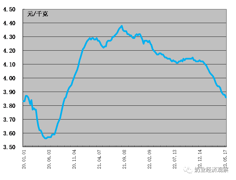据农业农村部监测数据,2023年5月生鲜乳月度均价3.88元/千克,环比下跌1.53%,已连续7月下跌,同比下跌6.7%。最后一周3.86元/公斤,比前一周下跌0.5%,同比下跌7.0%。