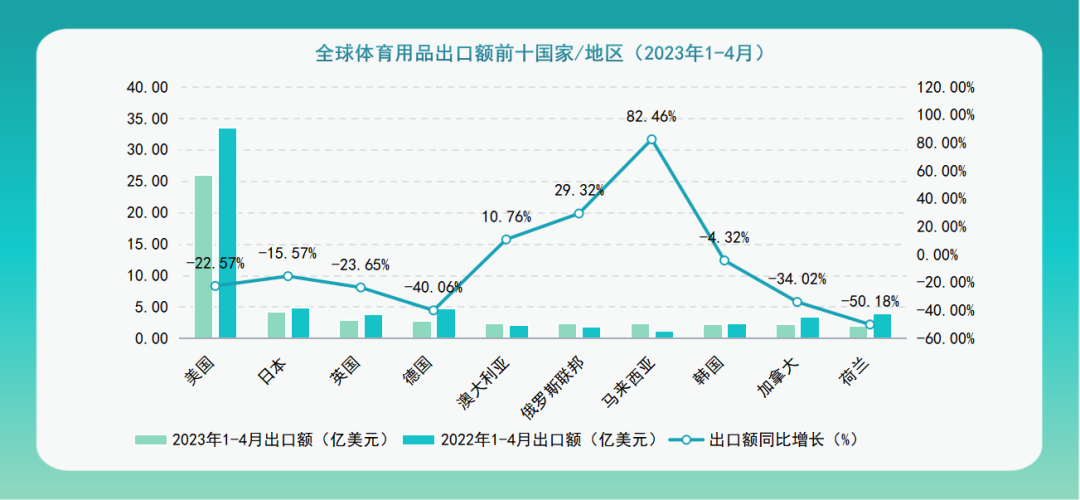 图:全球体育用品出口额前十国家/地区(2023年1-4月)