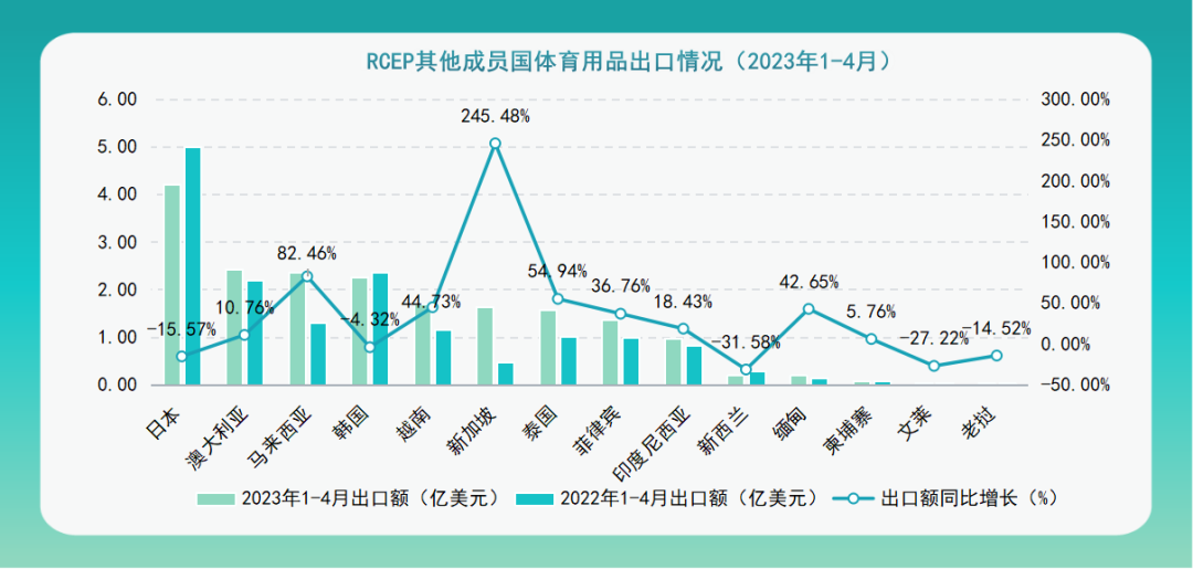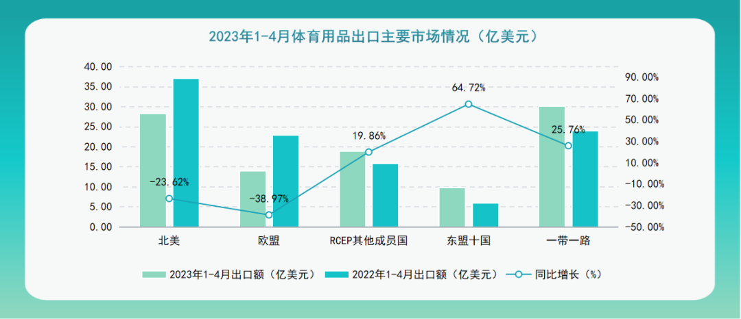 2023年1-4月,东盟仍是我国文体用品出口增速最快地区,我国文体用品对东盟地区出口额约34亿美元,同比增长68.73%;对RCEP其他成员国出口额约59亿美元,同比增长38.05%;对“一带一路”沿线国家出口额约97亿美元,同比增长43.81%;