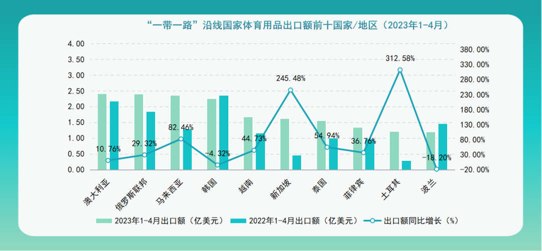 图:“一带一路”沿线体育用品出口额前十国家/地区(2023年1-4月)