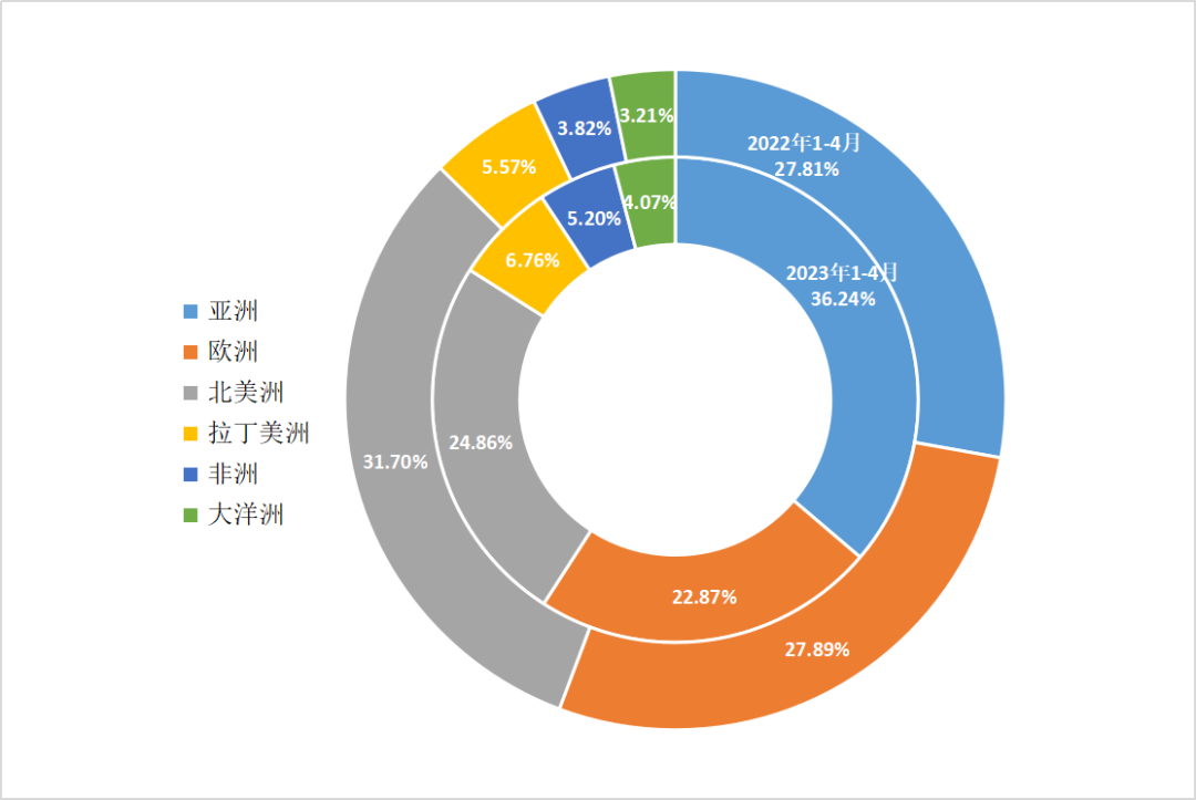 图:2023年1-4月文体用品各大洲占比情况(出口额)