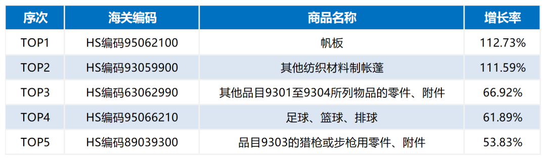 2023年1-4月出口额增长率TOP 5(体育用品产品类目)